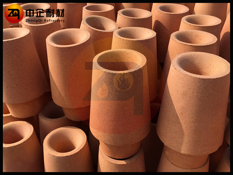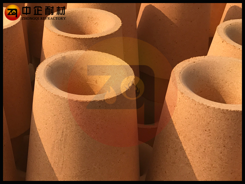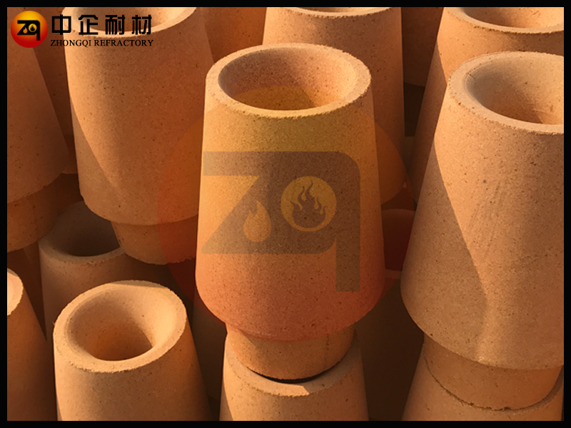 鑄口磚也叫水口磚,水口磚鑲嵌在盛鋼桶底部座磚中的耐火材料,鋼水流出口。不澆注時水口磚和塞頭磚呈線接觸,保證不漏鋼。水口磚上 口是弧面形,便于開啟、關閉水口及減小鋼水流動的阻力,下段是直線段以穩定注流。其材質與塞頭磚相近,可采用粘土質、高鋁質、鎂質 、鎂鉻質及鋯質的。澆注沸騰鋼及高錳鋼時黏土質的水口易被侵蝕,故采用鎂質或高鋁質水口磚。鎂質水口耐侵蝕 性強但導熱性也強,澆注中易產生結瘤。